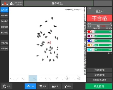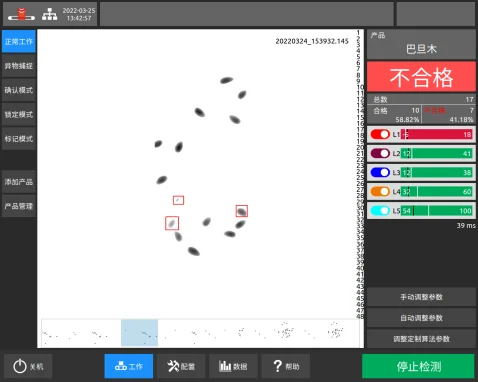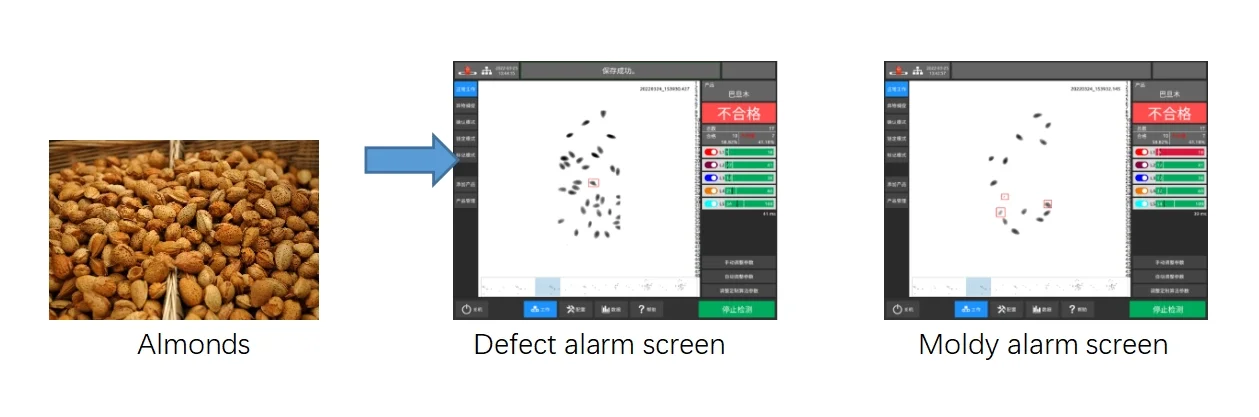 Fehlererkennung: Erkennen Sie die Fehler der Massenprodukte selbst, wie z. B. Wurmlöcher, Beschädigungen, hohle Schalen, Schimmel, Reiskrusten usw.